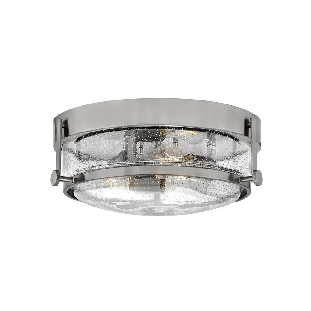 Harper's sleek, retro design elevates the traditional flush mount with a unique clear seedy glass bound by a prominent metal ring and decorative knobs available in five classic finishes.