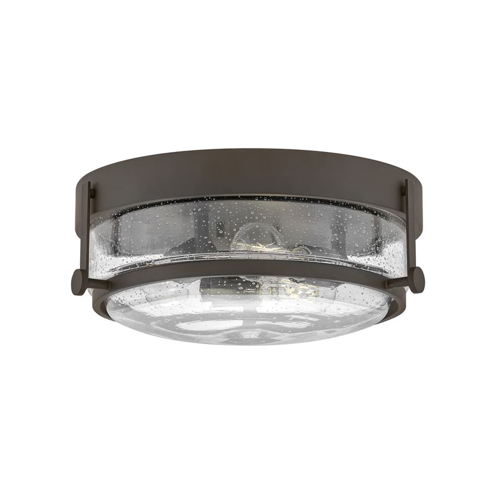 Harper's sleek, retro design elevates the traditional flush mount with a unique clear seedy glass bound by a prominent metal ring and decorative knobs available in five classic finishes.