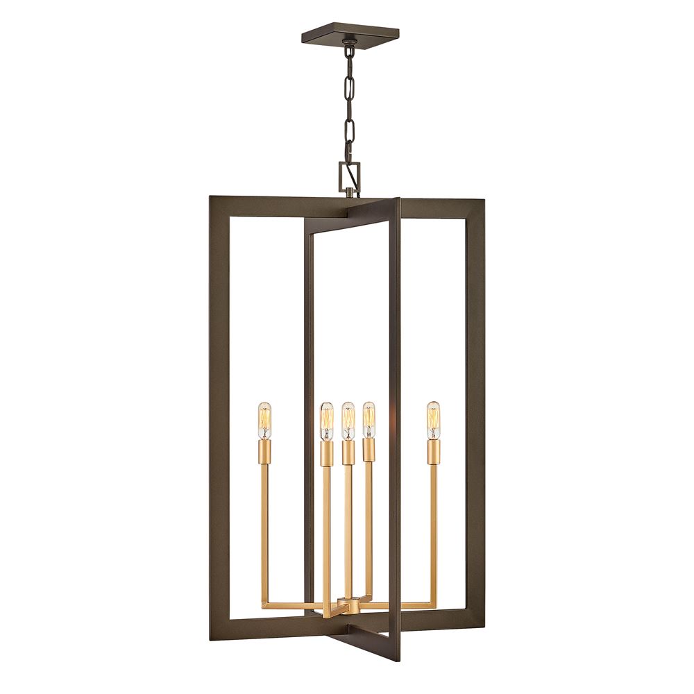 Anders is a staunch supporter of mixed metals and shapes. Metallic Matte Bronze finish rectangles intersect to create the boxy, open outer frame as the circular, spoked Deluxe Gold Accent finish candelabra branches out from inside. These contrasting but complementary elements make a powerful contribution to a transitional decor.