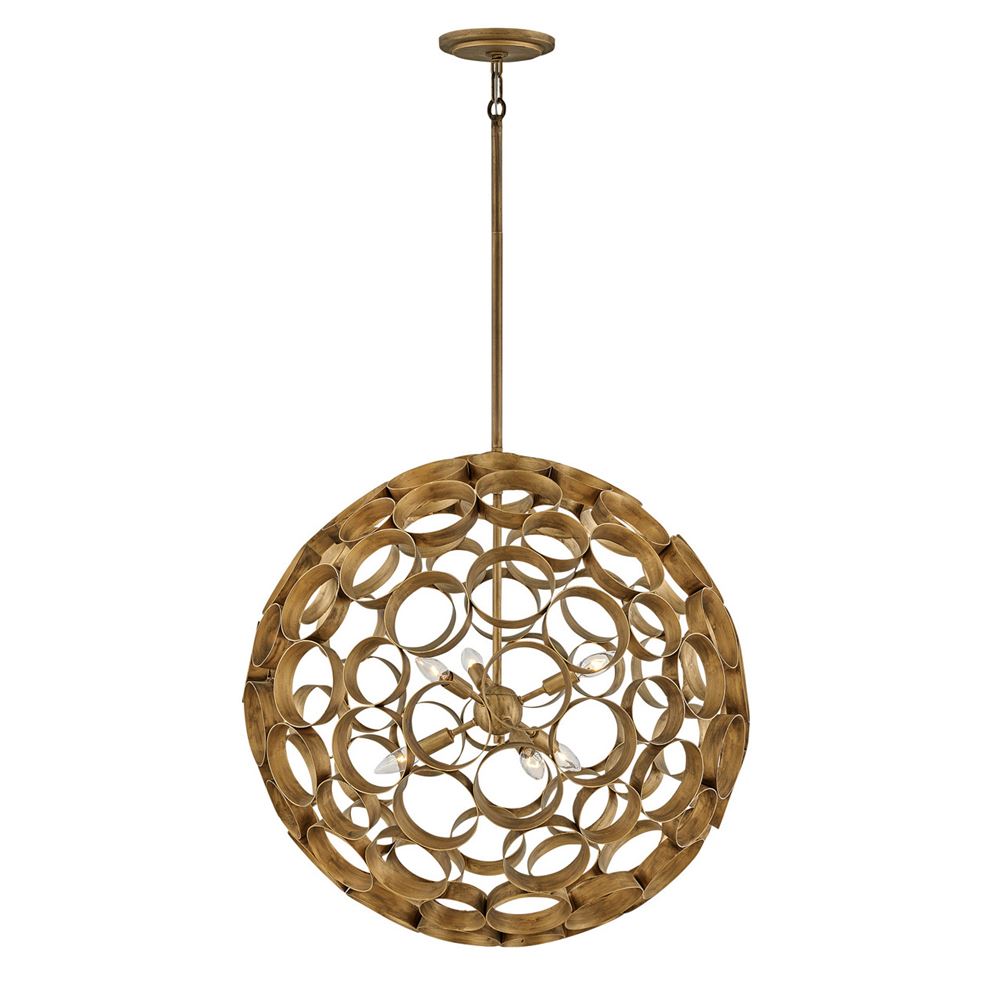 Hand-crafted, interconnected circles compose this stunning pendant. The unique construction, crafted in a modern Burnished Gold finish, forms an intricate globe encasing a starburst light cluster. Centric's stem-hung orb casts richly layered light patterns through its open frame sphere.