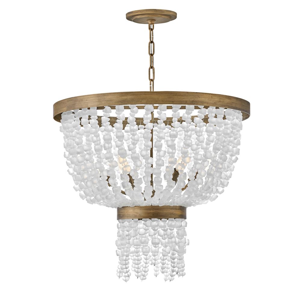 Dune's bohemian chic design showcases strands of soft white sea glass combined with a Burnished Gold finish. The designs blend a sophisticated silhouette with organic elements inspired by sun and surf. Dune infuses any space with a timeless, mesmerizing elegance.