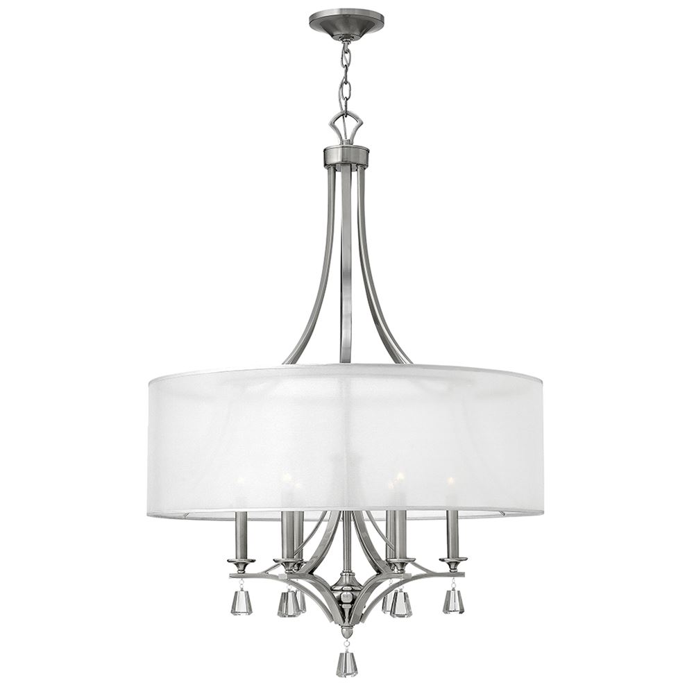 This elegant collection in our Brushed Nickel and French Bronze finish features a sheer translucent double hardback shade and tapered square crystal accents.