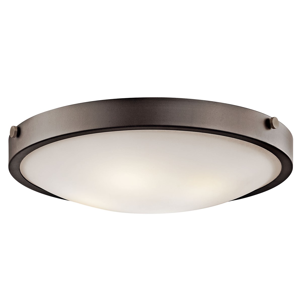 This versatile 4 light flush mounted ceiling fixture features a warm, Olde Bronze finish and Stain Etched White Glass that will effortlessly highlight any space in your home.