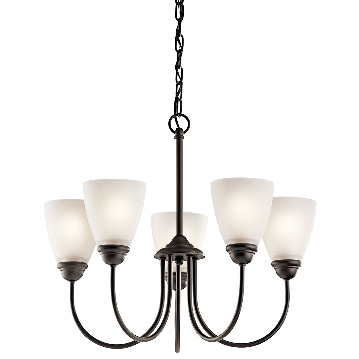 Enjoy the splendor of this Olde Bronze 5 light LED chandelier from the refreshing Jolie Collection. The clean lines are beautifully accented by satin etched glass. Jolie is the perfect transitional style for a variety of homes.