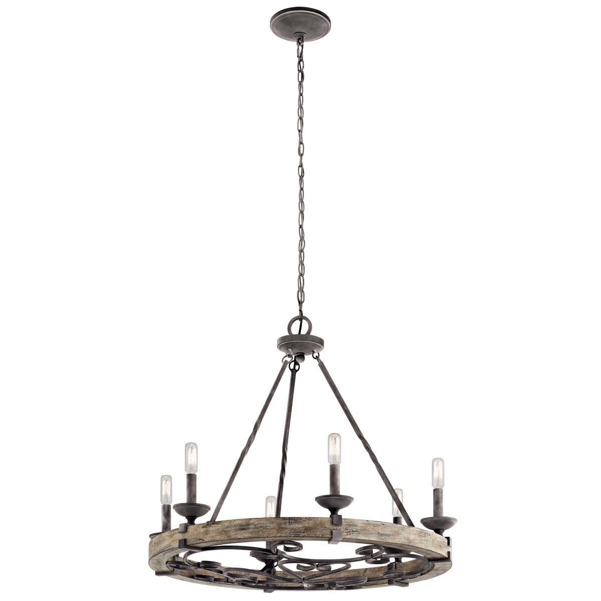 The Lodge inspired style of this 6 light chandelier from the Taulbee collection features an elegant, timeless design with Weathered Zinc detailing coupled with Weathered Grey Wood veneer accents.