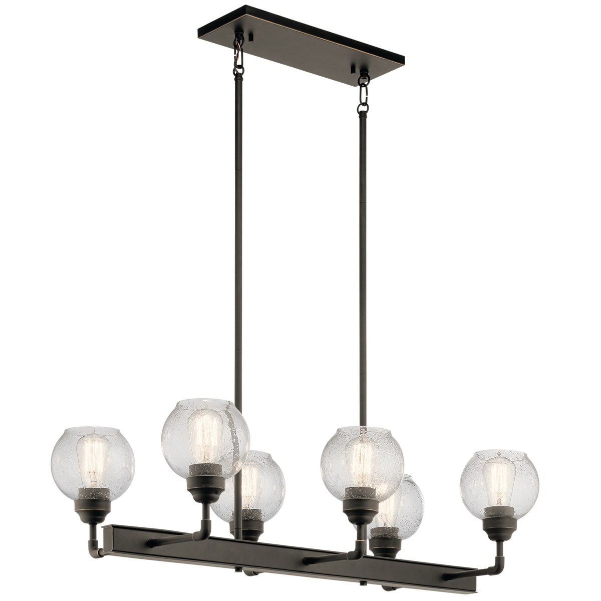 This Niles' Olde Bronze 6 light linear chandelier's globe style is reminiscent of fixtures found in historic metropolitan buildings, icons of the industrial era. Niles modernizes the look with clean lines for a look that works in any home.