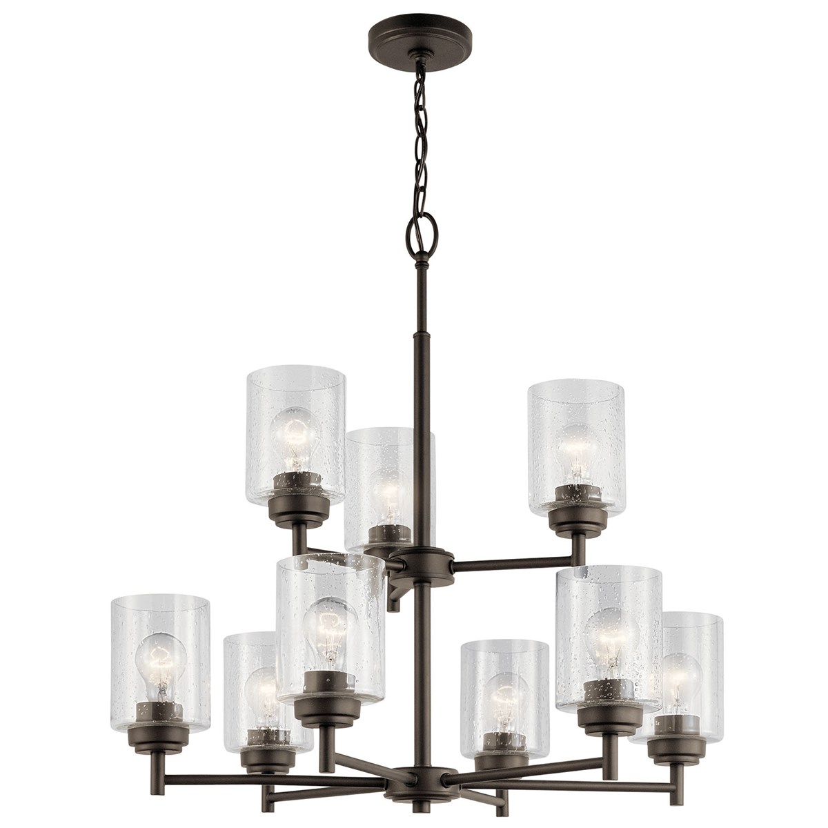 The modern Winslow 9-light chandelier in an Olde Bronze finish with Clear Seeded glass shade pair beautifully with the linear arms, bringing light and dimension to a space.