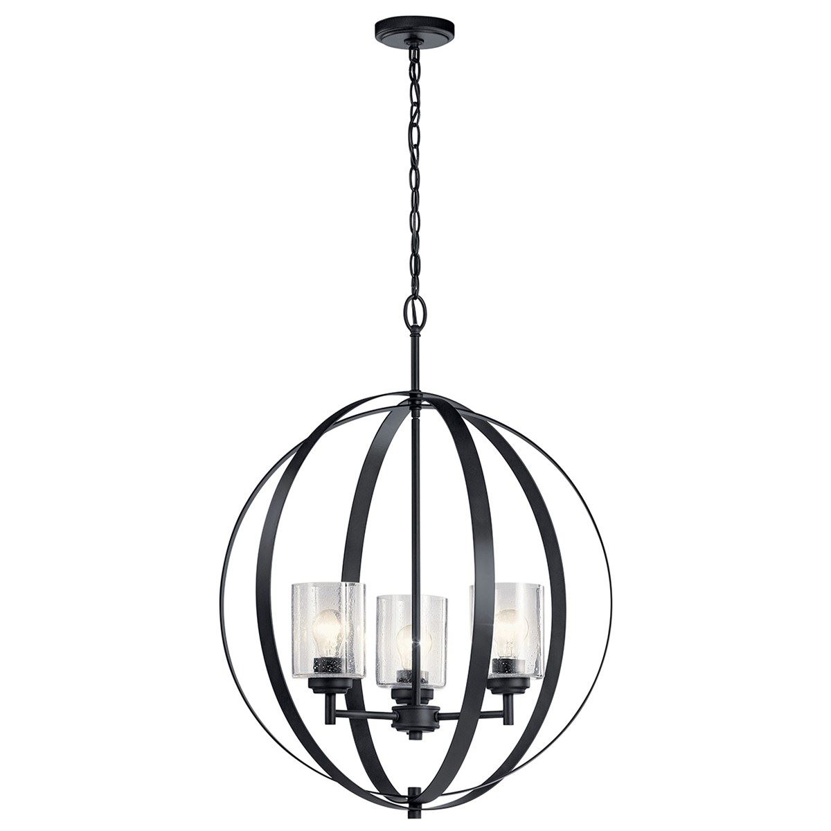 The modern Winslowâ„¢ 3-light chandelier in a Black finish with Clear Seeded glass shade pair beautifully with the linear arms, bringing light and dimension to a space.
