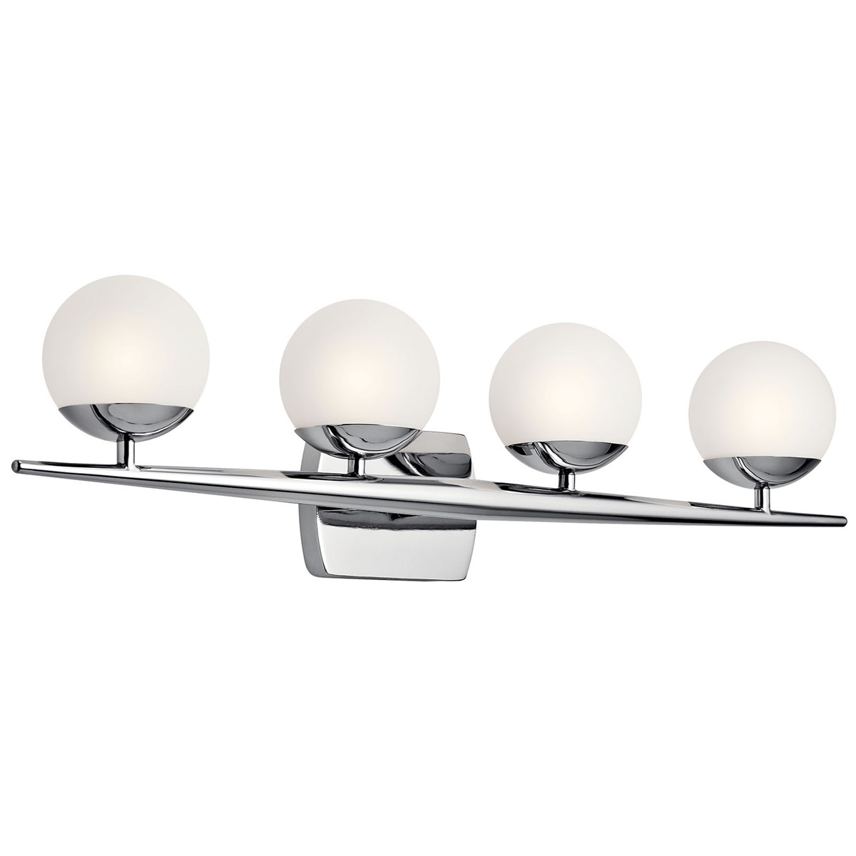This 4 light halogen bath light from the Mid-Century Modern Jasper collection features a gently tapered bar with Satin Etched Cased Opal globes nestled on Polished Chrome accents.