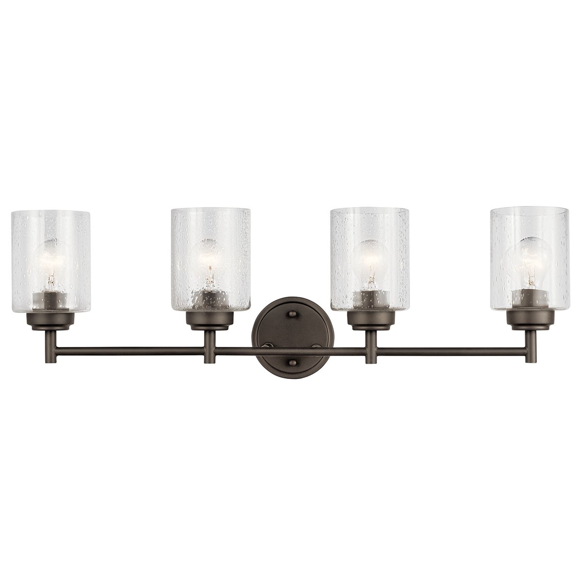 The modern Winslow 4-light 30in. bath light in an Olde Bronze finish with Clear Seeded glass shade pair beautifully with the linear arms, bringing light and dimension to a space.