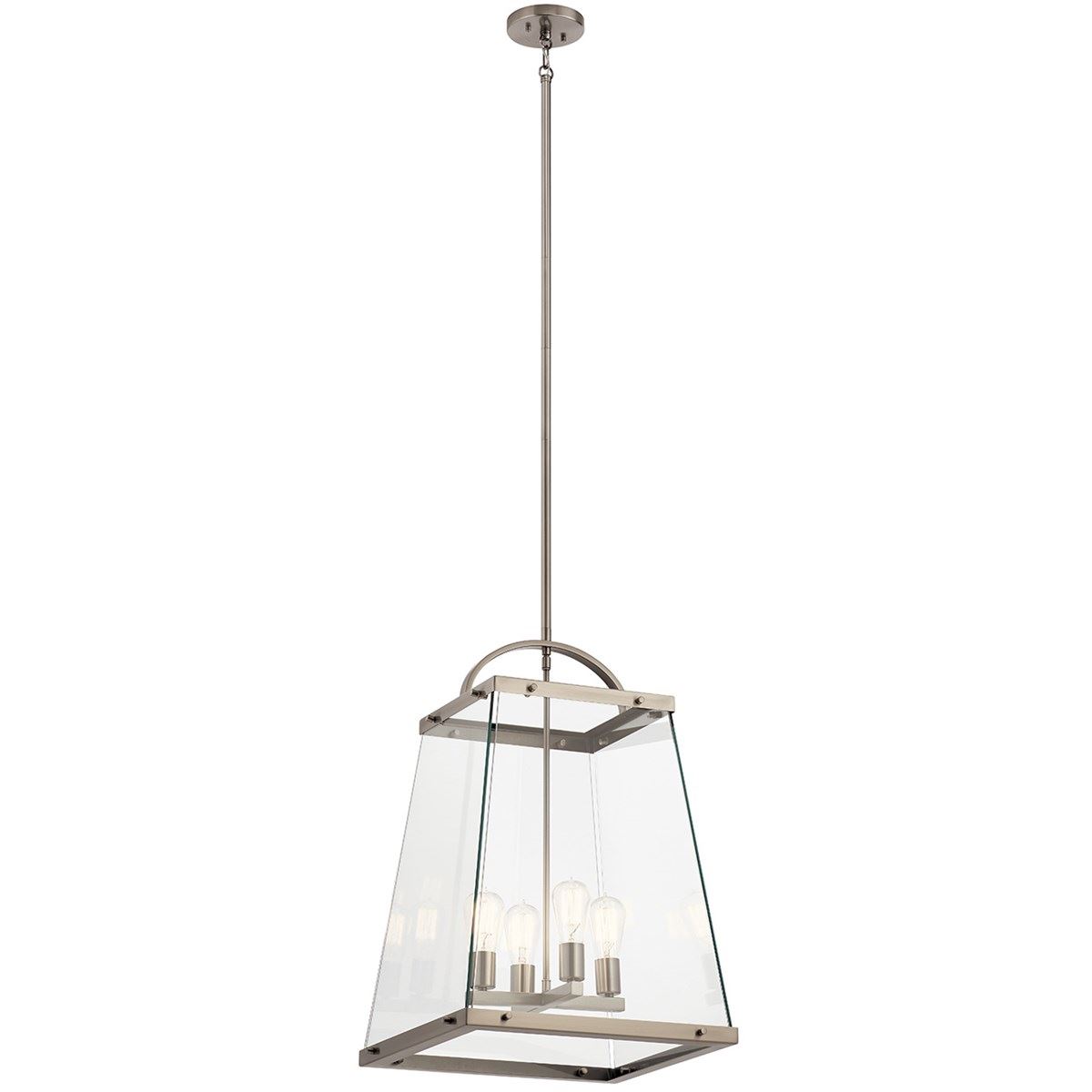 The Darton™ 25.75in. 4 light large foyer pendant with fluid lines with clear glass and Classic Pewter finish. A perfect addition in several aesthetic environments, including traditional, transitional and contemporary.