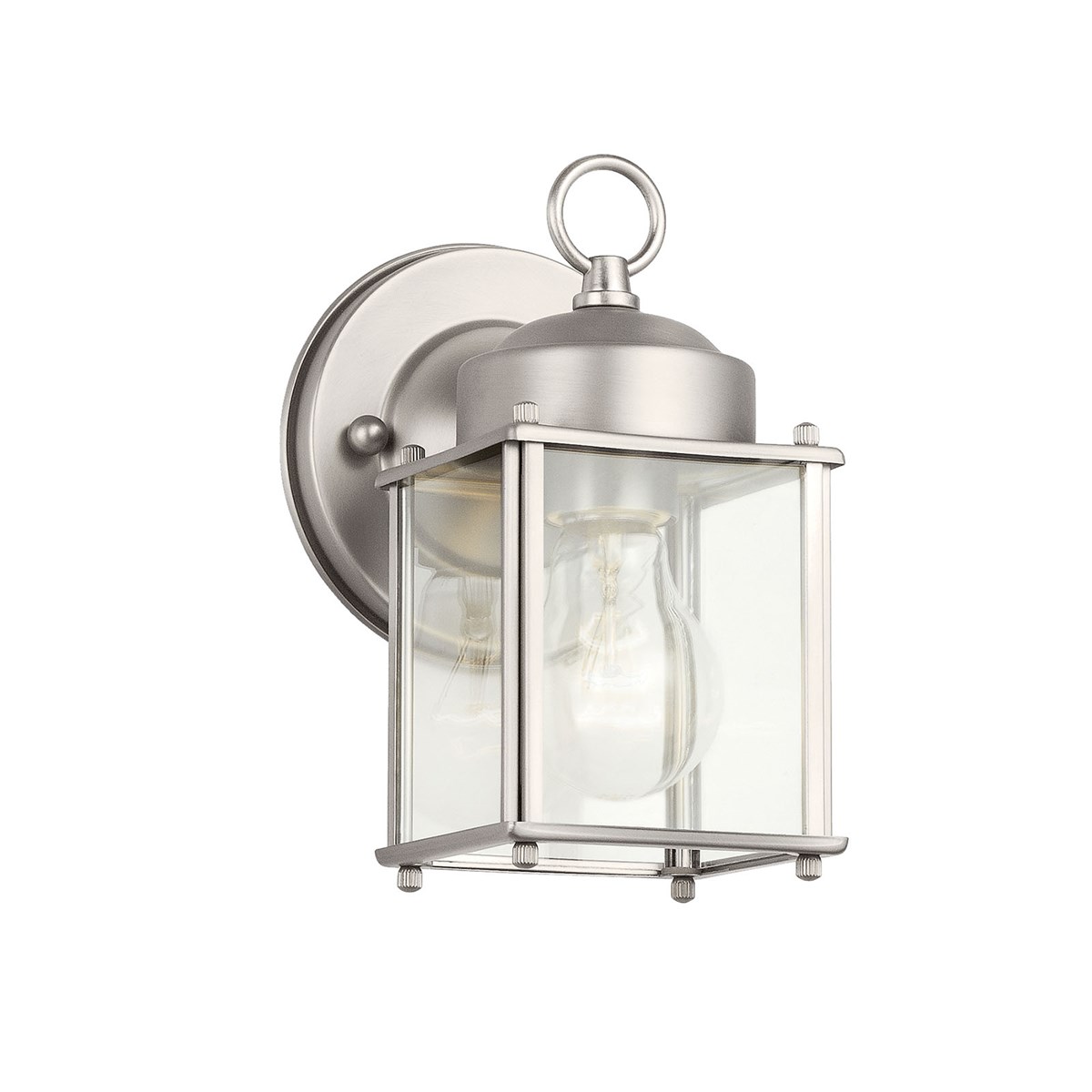 The one light New Street Wall Lantern features a classic profile with Sterling Silver finish and clear glass panels. It uses a 60-watt (max.) bulb, measures 8in. high, and is U.L. listed for wet location.