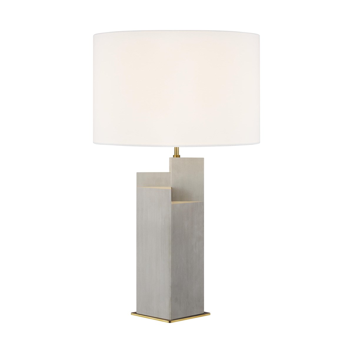The Portman family of lamps from Kelly for Generation Lighting exudes post-modern charm. A white linen shade sits atop clean architectural steps with the sculptural quality of being carved from a single stone. The lamp base comes in four different ceramic glaze options - Royal Blue, Blush Pink, Arctic White or Natural Concrete - paired with Burnished Brass or Polished Nickel hardware.