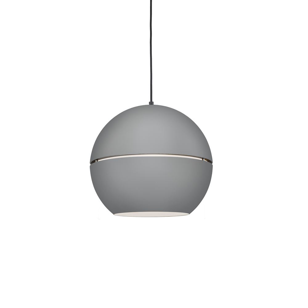 Single lamp pendant with split spherical aluminum shade showcasing powder-coated finishes against a matte white interior. Exterior shade colors are gray, white or blue. Suspended by cloth cable to a maximum 120” length. Available in 3 sizes.