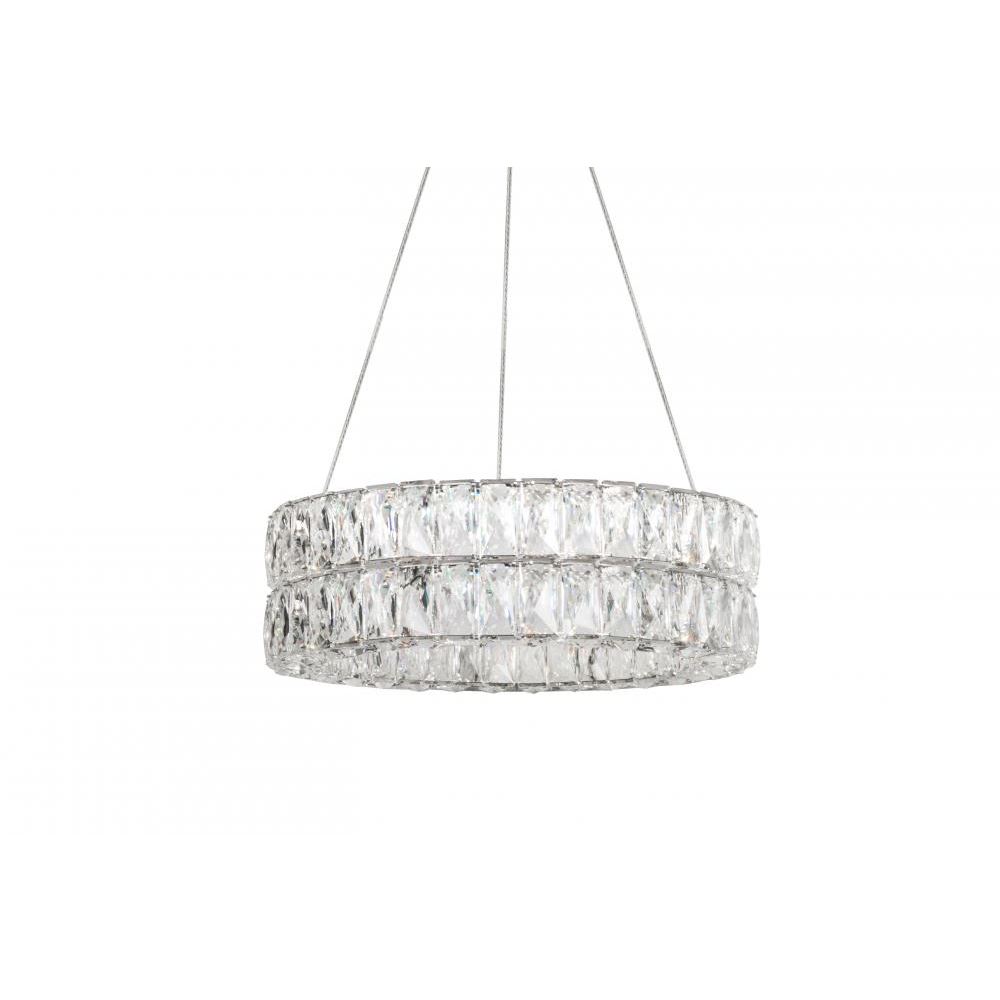 Aircraft cable suspended pendant with a double circular ring of diamond cut clear crystal glass and circular Chrome canopy. The inner chassis combines with the double-layer crystal ring and concealed LED arrays to form a crisp, elegant appearance bridging classic old-world and modern minimal design elements. 20 inches in diameter - the smallest in a series of four sizes.
