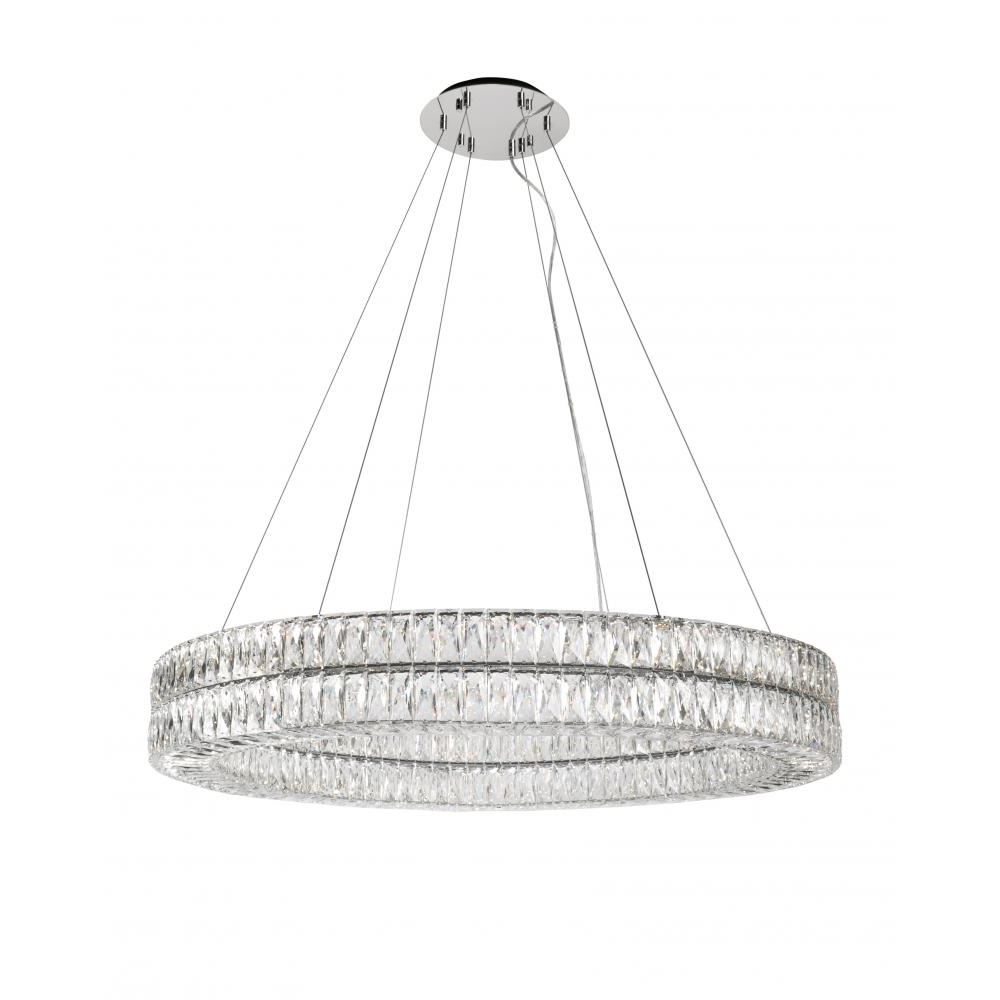 Aircraft cable suspended chandelier with a double circular ring of diamond cut clear crystal glass and circular Chrome canopy. The inner chrome chassis combines with the double-layer crystal ring and concealed LED arrays to form a crisp, elegant appearance bridging classic old-world and modern minimal design elements. 59 inches in diameter - the largest in a series of four sizes.
