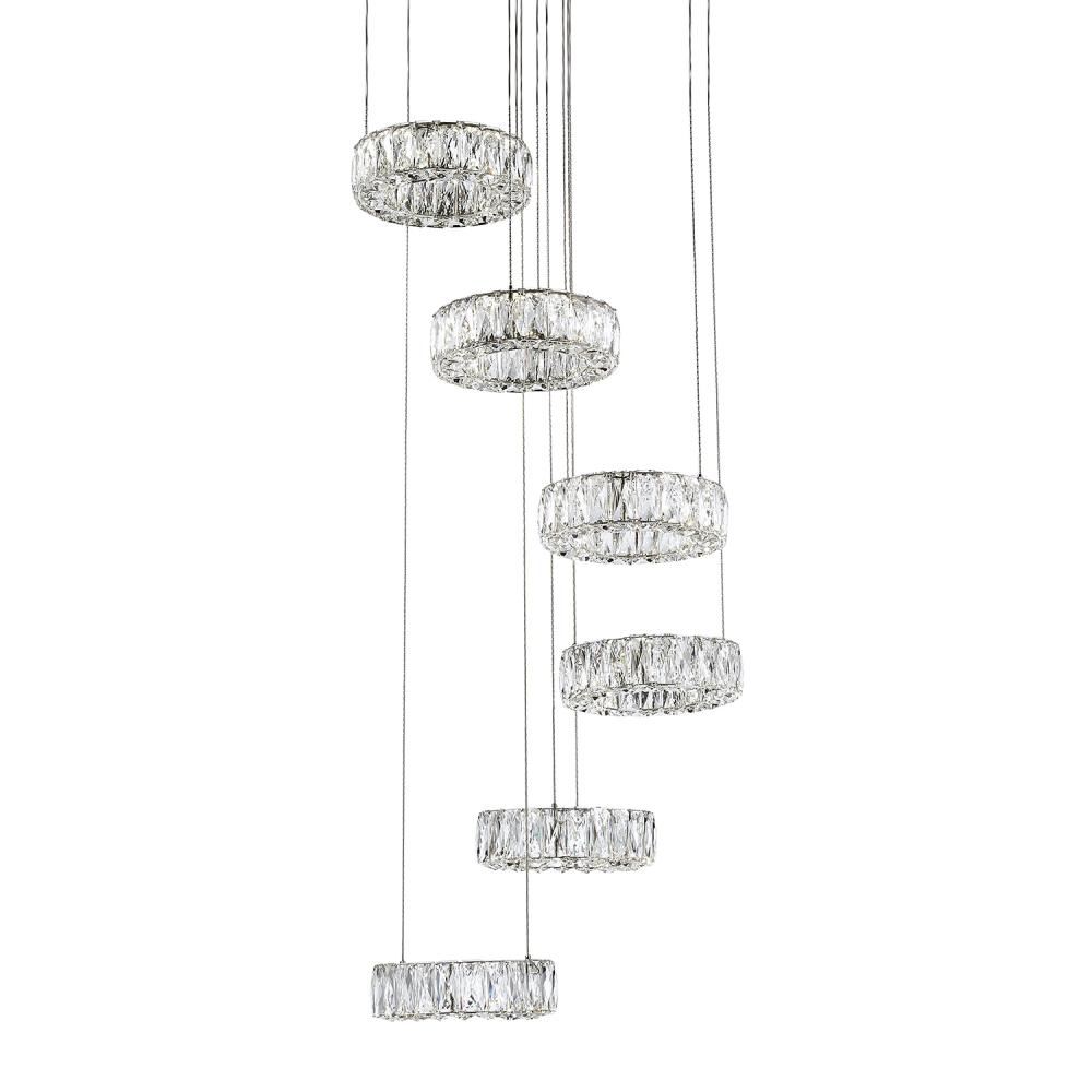 Six tiered LED chandelier which can be styled in a variety of different arrangements. Each crystal ring has exquisite diamond cut clear crystals which reflects the light beautifully within the chandelier and around the surrounding room. This grand chandelier has a maximum cable length of 120", and is provided with our powerful 120V AC LED technology, 81W, fully dimmable.