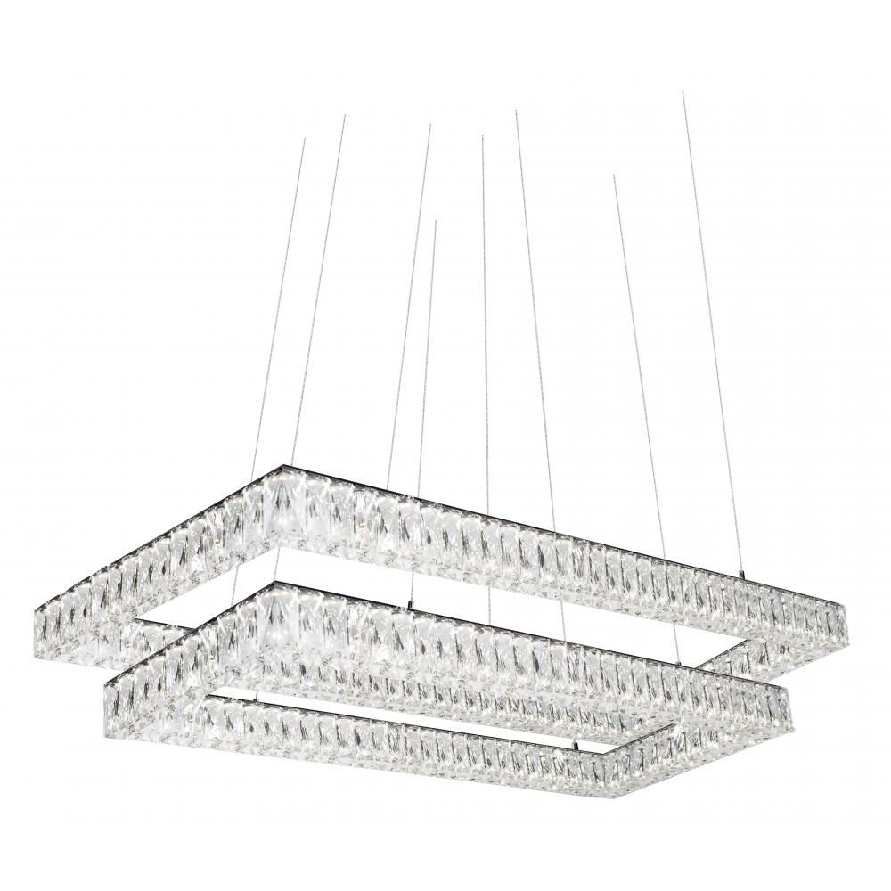 Aircraft cable suspended chandelier with a nested pair of diamond cut clear crystal glass rectangular fixtures with matching and rectangular chrome canopy. The two element’s heights are individually adjustable in height and angle. The inner chrome chassis combines with the crystal glass and concealed LED arrays to form a crisp, elegant appearance bridging classic old-world and modern minimal design elements.