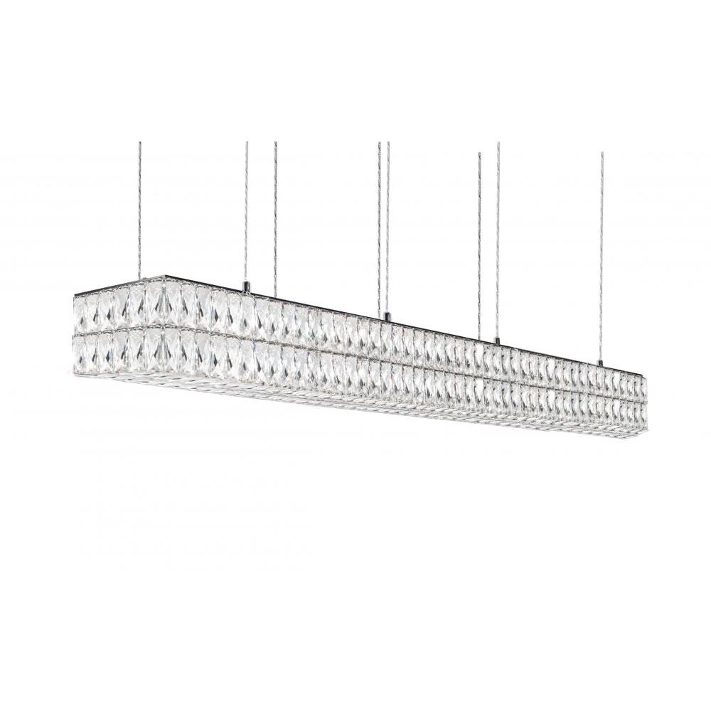Aircraft cable suspended linear pendant with linear diamond cut clear crystal glass and rectangular Chrome canopy. The inner chrome chassis combines with the double-layer crystals and concealed LED arrays to form a crisp, elegant appearance bridging classic old-world and modern minimal design elements. The second in a series of three sizes.