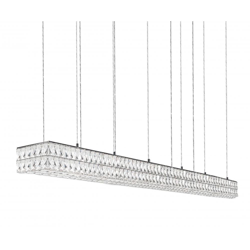 Aircraft cable suspended linear pendant with linear diamond cut clear crystal glass and rectangular Chrome canopy. The inner chrome chassis combines with the double—layer crystals and concealed LED arrays to form a crisp, elegant appearance bridging classic old-world and modern minimal design elements. The largest in a series of three sizes.