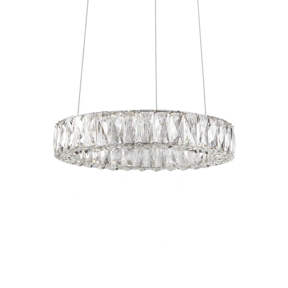 Single ring LED pendant, with exquisite diamond cut clear crystals which reflects the light beautifully within the pendant and around the surrounding room. This unique pendant has a maximum cable length of 120", and is provided with 120V AC LED technology, 23W, fully dimmable. Available in three different sizes or in multi-tiered arrangements, see series information for full family.