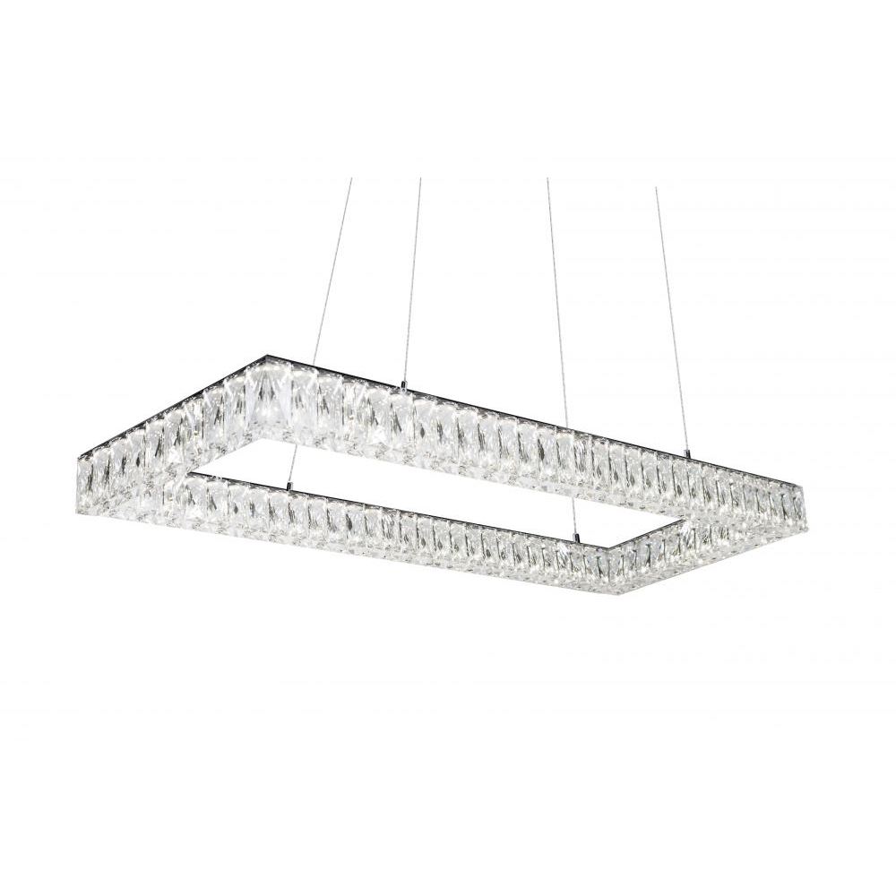 Aircraft cable suspended pendant with single rectangular ring of diamond cut clear crystal glass and rectangular Chrome canopy. The inner chrome chassis combines with the single-layer crystals and concealed LED arrays to form a crisp, elegant appearance bridging classic old-world and modern minimal design elements.
