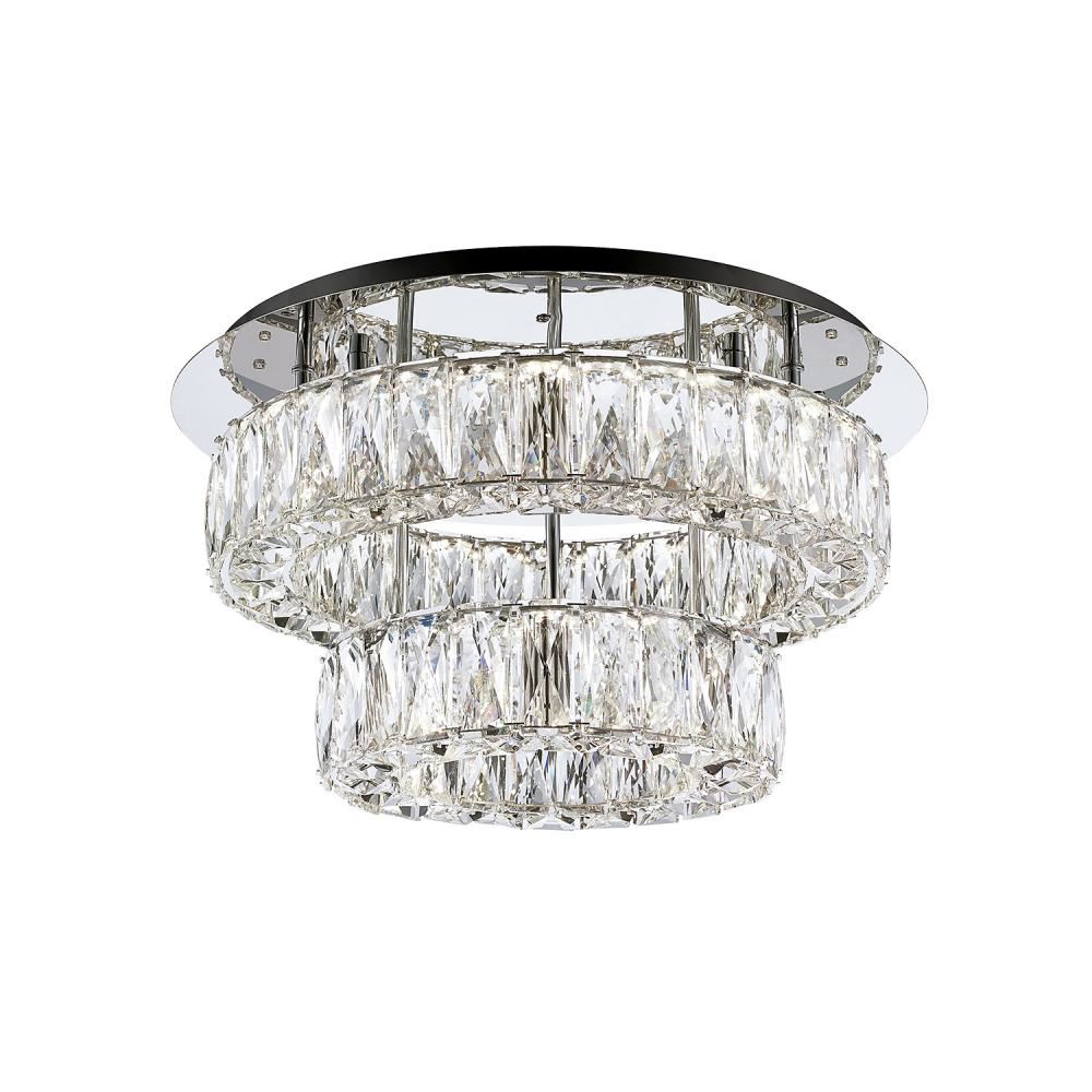Two tiered LED semi-flush mount with two different sized rings. Each crystal ring has exquisite diamond cut clear crystals which reflects the light beautifully within the fixture and around the surrounding room. Equipped with our powerful 120V AC LED technology, 36W, fully dimmable. Available in two different sizes, view series for full family details on a variety of semi-flush, vanity, single pendant and multi-pendant arrangements.