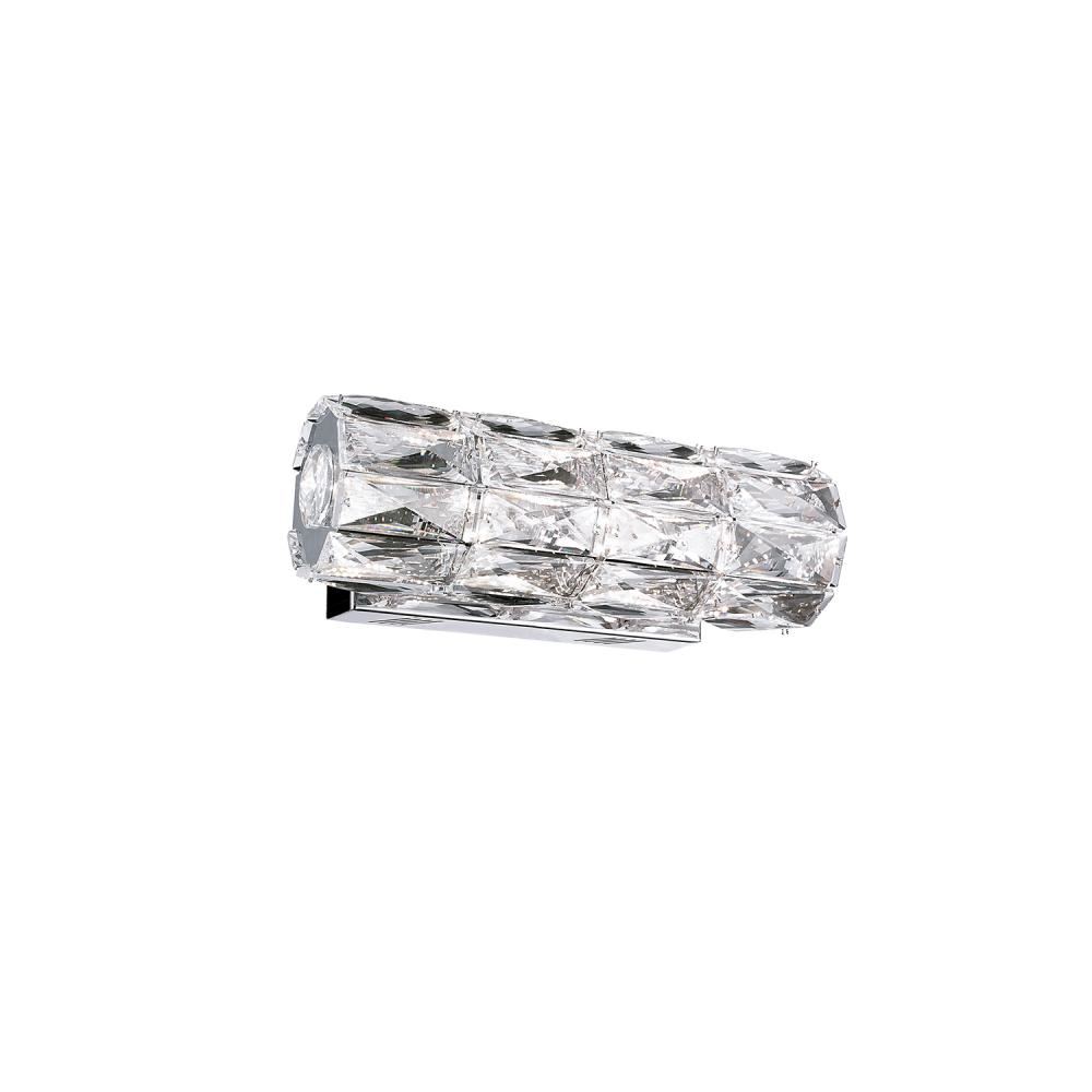 Cylinder shaped LED wall sconce, with exquisite diamond cut clear crystals which reflects the light beautifully within the fixture and around the surrounding room. This unique wall sconce has fine polished chrome metal finish, and is provided with our powerful 120V AC LED technology, 9W, fully dimmable. Can be mounted horizontally or vertically and is available in four different lengths and many other styled pendant arrangements, see series information for full family.