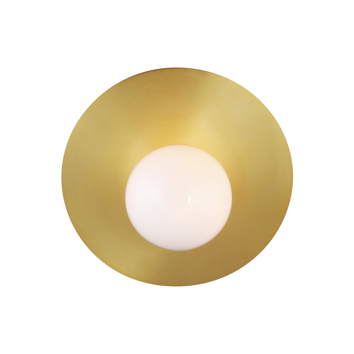 Nodes task, ceiling and wall lighting is minimal yet bold, highlighting Kelly's distinctive juxtaposition of mixed-materiality and curvilinear form. Light radiates from milk glass globes set against metal discs. All fixtures can be used or without the discs. The cast canopy is available in Burnished Brass or Midnight Black. Hanging fixtures within this family feature black fabric cords, while pivot sconces can be cord and plug or hard wire.