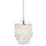 Soft contemporary styling combined with organic texture and iridescence. The Elsa collection 1L pendant is a unique option for use above an eating area, or (in multiples above) an elongated island, or to accent a small room or foyer space. Tiers of hand-strung natural Capiz shells create a soft diffused light that perfectly compliments the satin nickel metal elements. This is a full collection with coordinating pieces to decorate any room in the house.