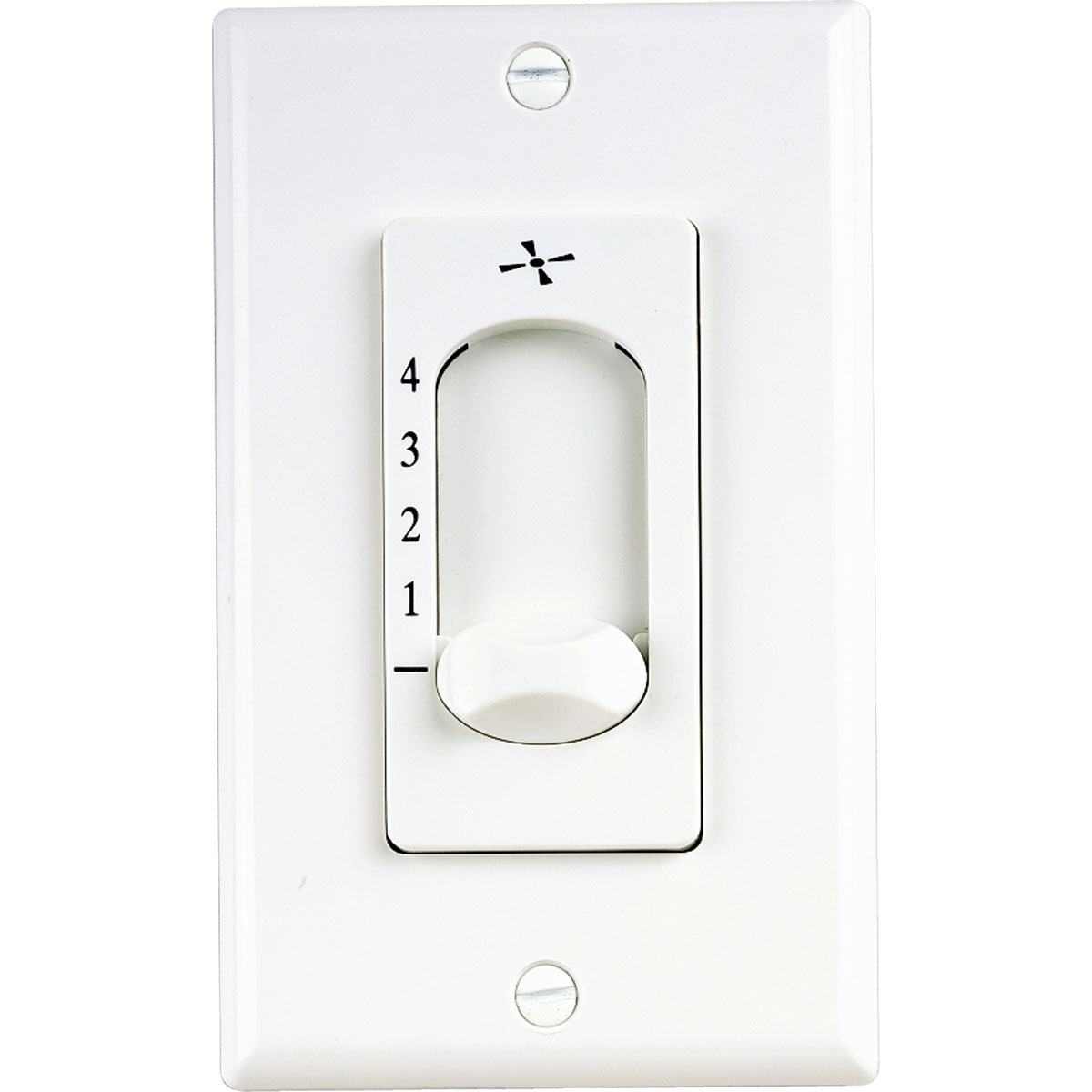 White color;Provides convenient operation for fans with pull-chains.;Four-speed control (1=Fastest, 4=Slowest).;Use with or in place of hand-held remote included with fans that have a downlight cover.;Switchplate cover is included for mounting.;Includes wire nuts for the electrical connections;Not for use with multiple fans;Rated at 1.25amps. 120VAC/60Hz.;UL Listed