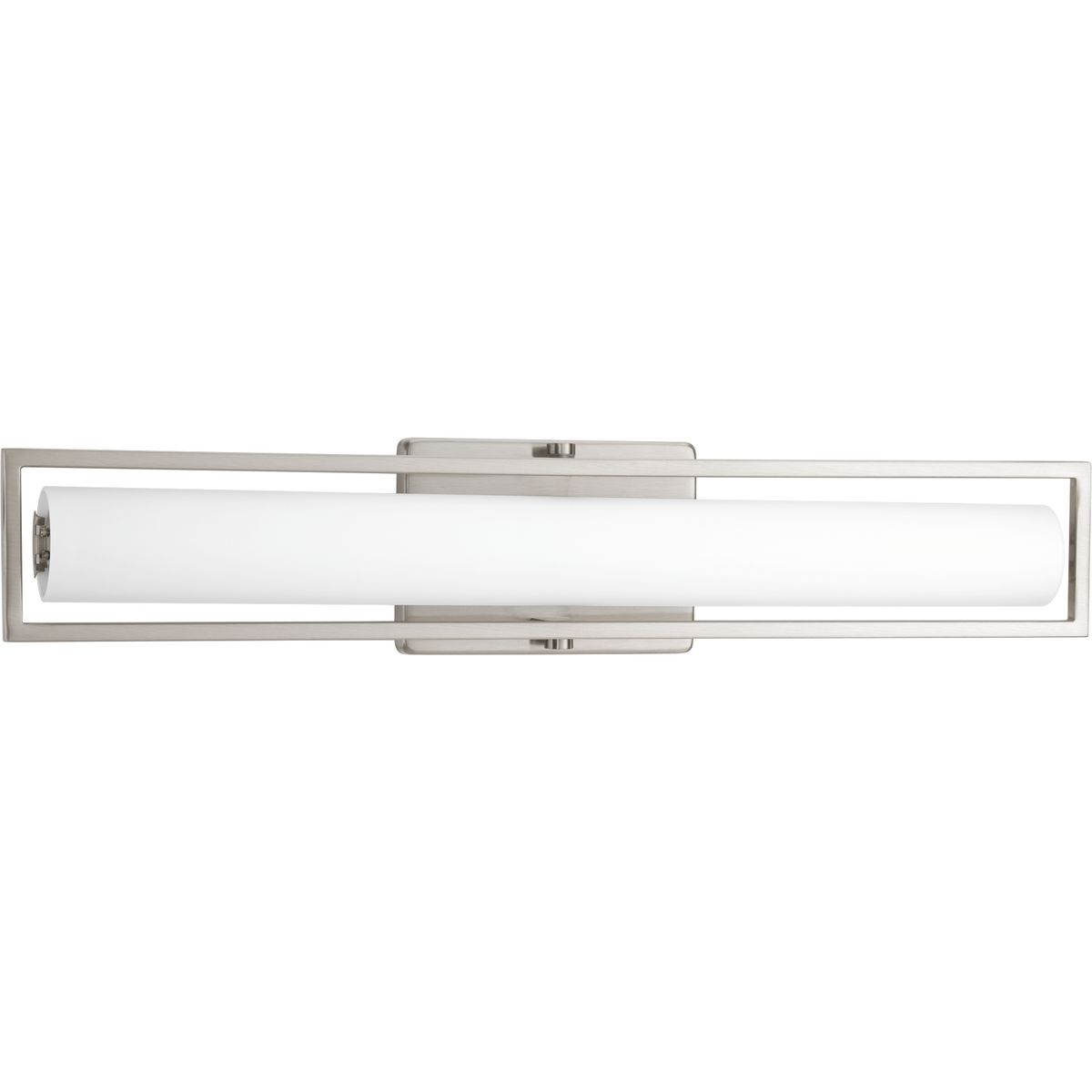 Modern architectural styling frames with an integrated LED source and circular etched opal glass. For increased design options, fixtures can be installed horizontally or vertically. Frame 24" bath and vanity fixture provides beautiful and continuous illumination, as well as energy saving benefits. 3000K, 90+ CRI. Complimented by a Brushed Nickel finish.