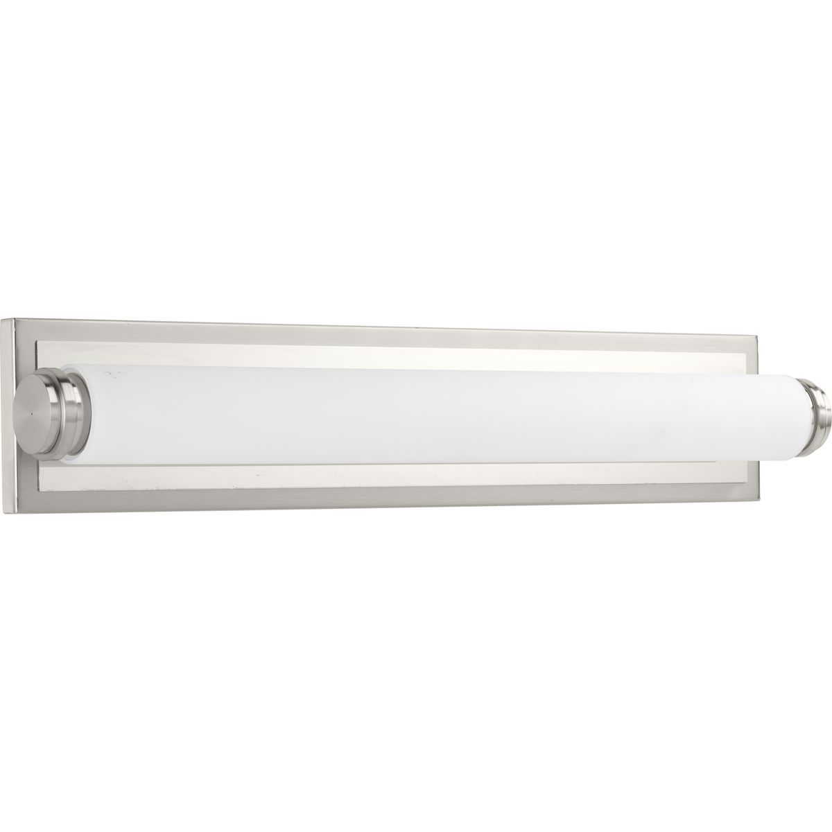 Architectural details and a full size canopy are key elements in Concourse LED vanity fixtures. A dual tone reflector frames the canopy to provide a mirror like effect. Etched opal glass is paired with Brushed Nickel and polished stainless accents in this versatile 24" cylindrical fixture.
