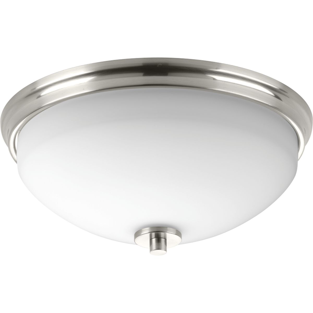 The two-light Replay flush mount features a linear form that provides a pleasingly elegant accent to your home. A sleek, metallic finish is complemented by white glass diffusers for a clean, modern silhouette. Brushed Nickel finish.
