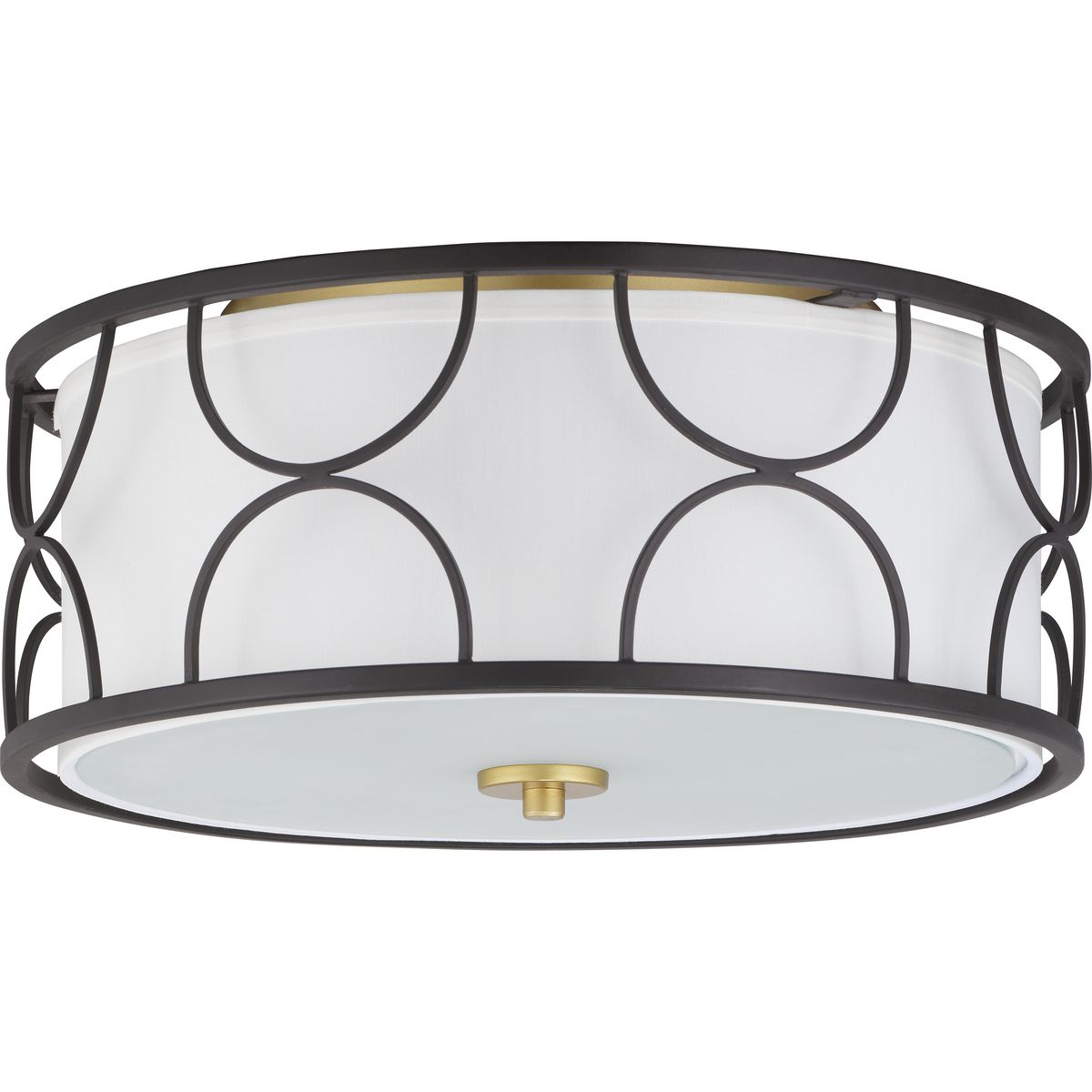 Exaggerated scale and elegant finishes define Landree’s collection of lighting fixtures;A white silk shade on the three-light flush mount fixture highlights the metal frame;Close-to-ceiling lights like this semi-flush convertible are natural choices for bathrooms, bedrooms, dens, hallways and other small rooms;An excellent choice for Modern and Luxury interiors;Dramatic Black finish with Vintage Gold accents;Measures 16in diameter x 6 5/8in ht.;Uses three 60-watt max. medium base bulbs or LED equivalent (sold separately);CSA Safety listed for use in damp locations;Compatible with standard wall dimmer;Progress Lighting products are designed for exceptional quality, reliability, and functionality;Includes installation instructions and mounting hardware;Coordinating fixtures available