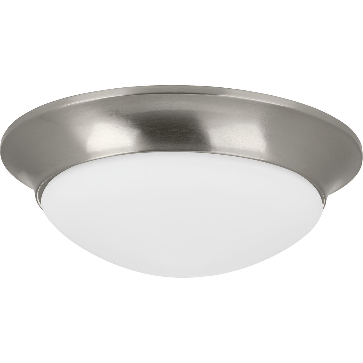 Ideal for installing in pairs in a dining room, living room, bedroom or kitchen, to use in multiples in a hallway or for lining a staircase;Clean, straightforward design makes it ideal for transitional settings;Two-light flush mount with a minimalist look;Wide, crown molded-inspired, metal bands for an added architectural detail;White, etched glass bowl emits a soft, comfortable glow;Finished in subtly reflective Brushed Nickel;Measures 14 in diameter X 4-5/8 in height;Uses two 60-watt max medium base bulbs, or the LED equivalents, that are sold separately;Includes installation instructions and mounting hardware;Progress Lighting products are designed for exceptional quality, reliability, and functionality