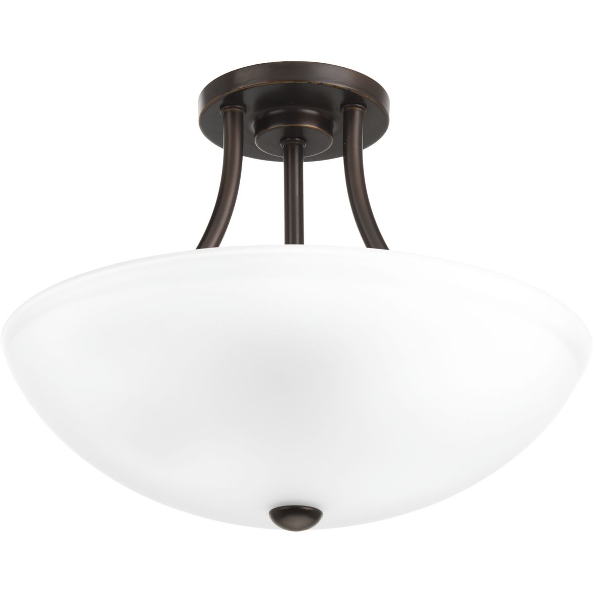 Two-light semi-flush/convertible from Gather possesses a smart simplicity to complement today's home. Antique Bronze metal arms descend downwards and curve sharply to prop white etched glass shades. Etched glass add distinction and provide pleasing illumination to your room. Coordinating fixtures from this collection let you decorate an entire home with confidence and style.