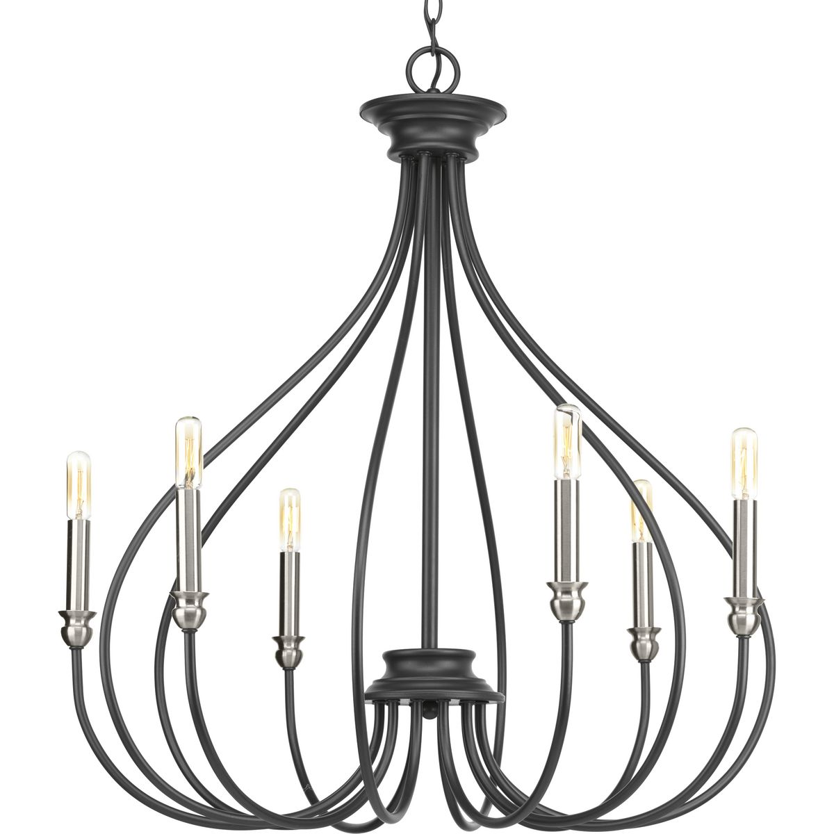 An updated traditional family, Whisp adds distinction to interior spaces. Candles with brushed nickel accents complement a gracefully scrolled frame in a cool Graphite finish. Six-light chandelier perfect for dining room, entry way and kitchens.