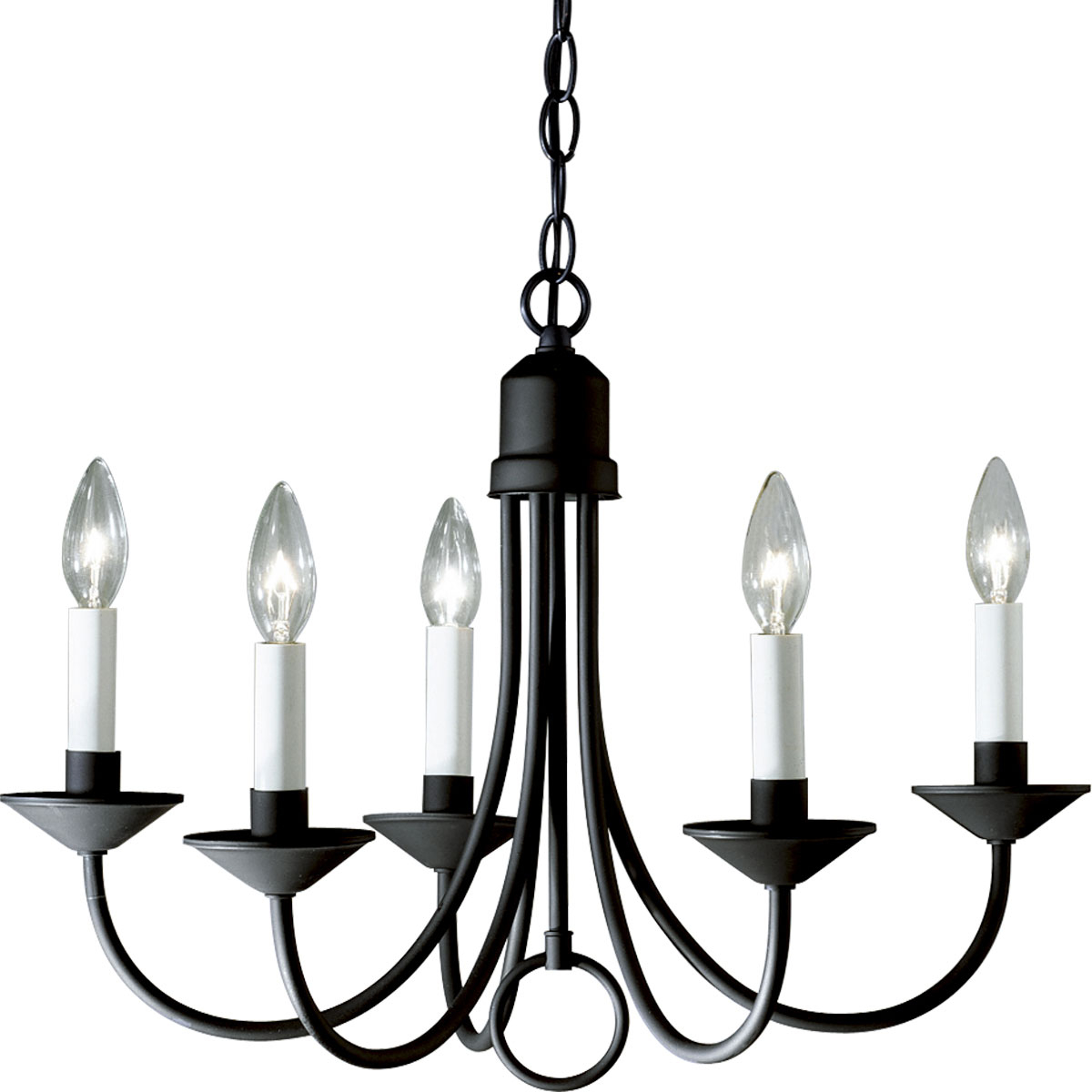 This simple, classic five-light chandelier is popular in the vintage farmhouse inspired designs. White candle covers and a decorative loop detail complete the look. Black finish.