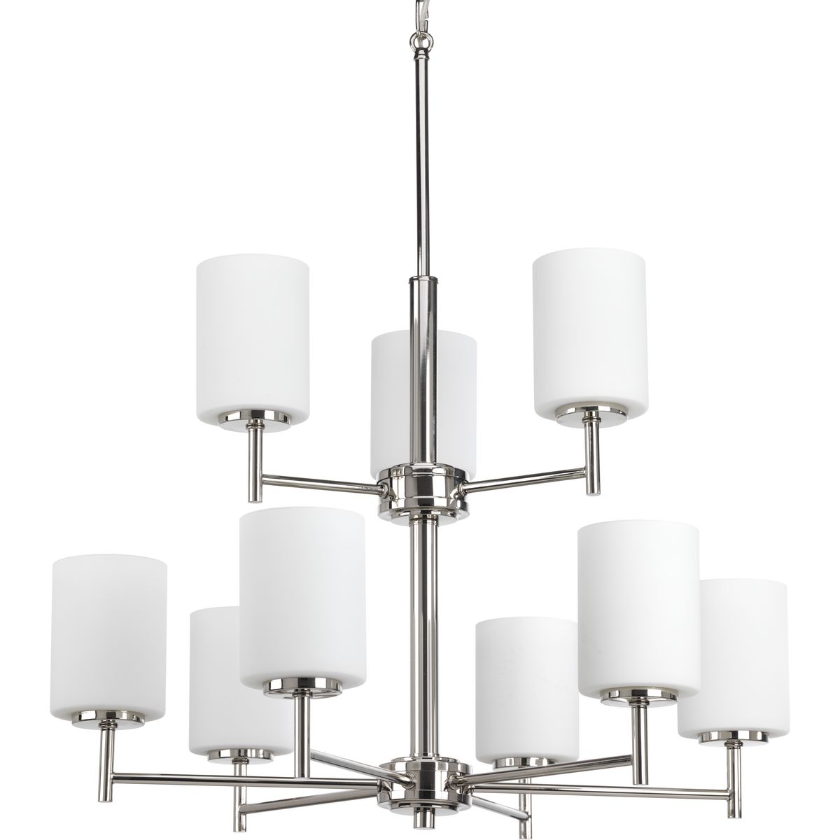 Nine-light, two-tier chandelier from the Replay Collection, feature smooth forms, linear details and a pleasingly elegant frame enhance a simplified modern look. Arms can be faced up or down. Polished Nickel finish.