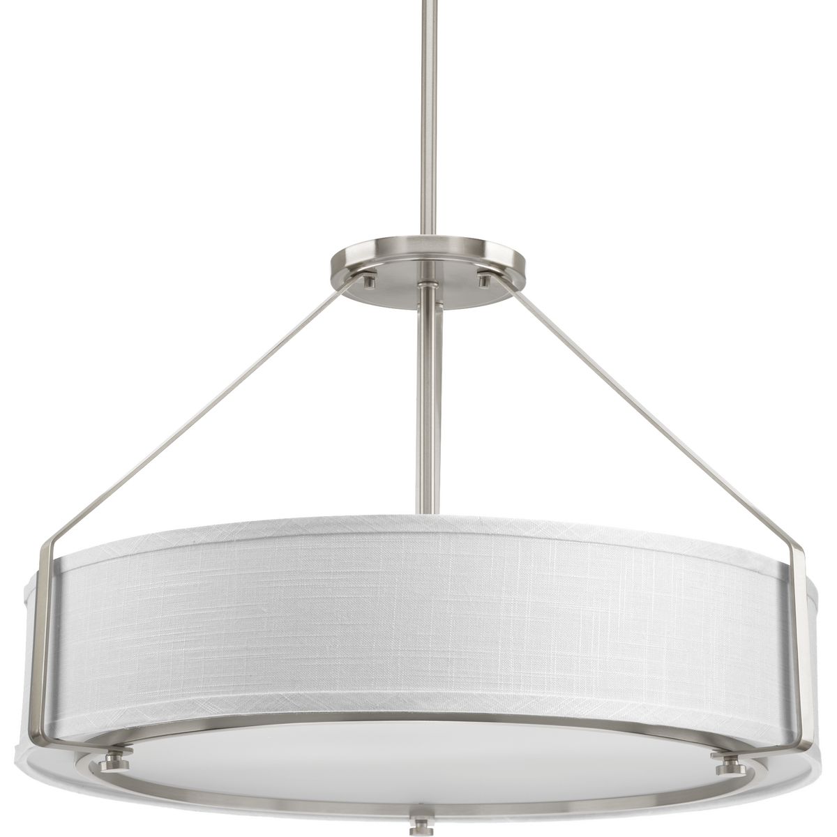 The four-light pendant offers a sleek metal frame that supports a low-slung shade to create Ratio’s casual modern style. The frame’s proportion to the white linen drum shade evokes a perfect ratio for lighting. Includes a polished glass exterior, etched glass interior diffuser that offers an elegant appeal and is easier to clean – offering both fashion and function. Brushed Nickel finish.