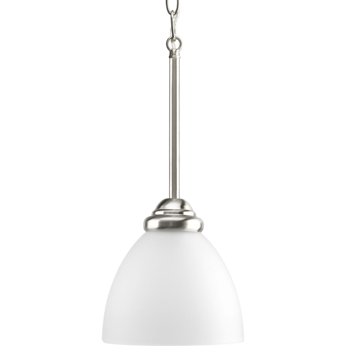 One-light Brushed Nickel mini-pendant with etched glass shade.