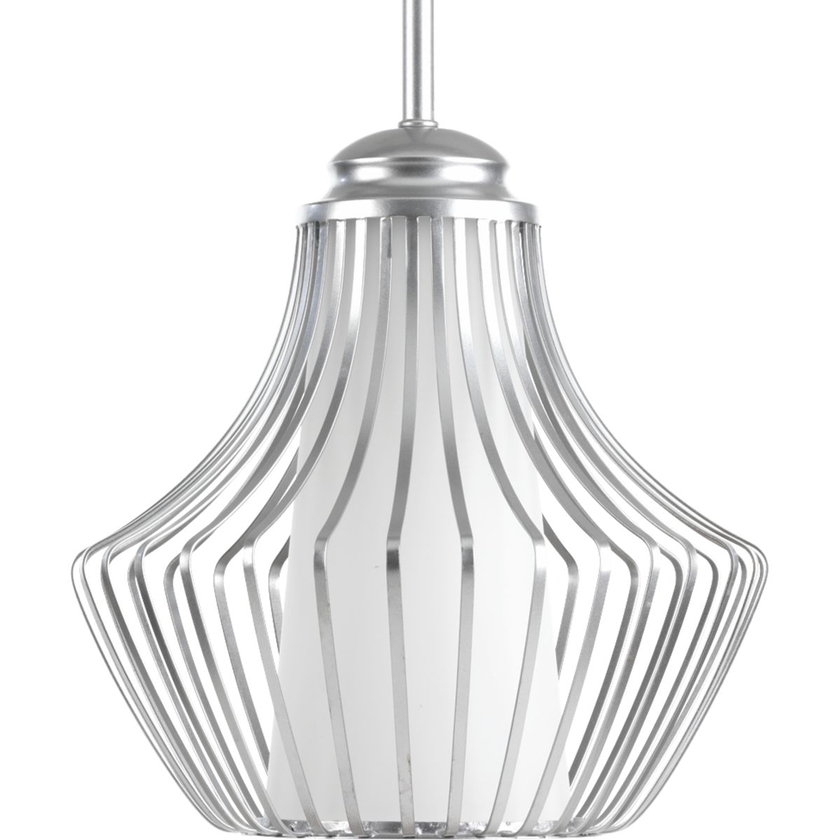 New perspective on an open cage design.;The beautifully graphic frame wraps around an etched white glass shade.;Frame creates a focal aperture for a single bulb.;Includes one 6", four 12" stems and 6 links of chain.