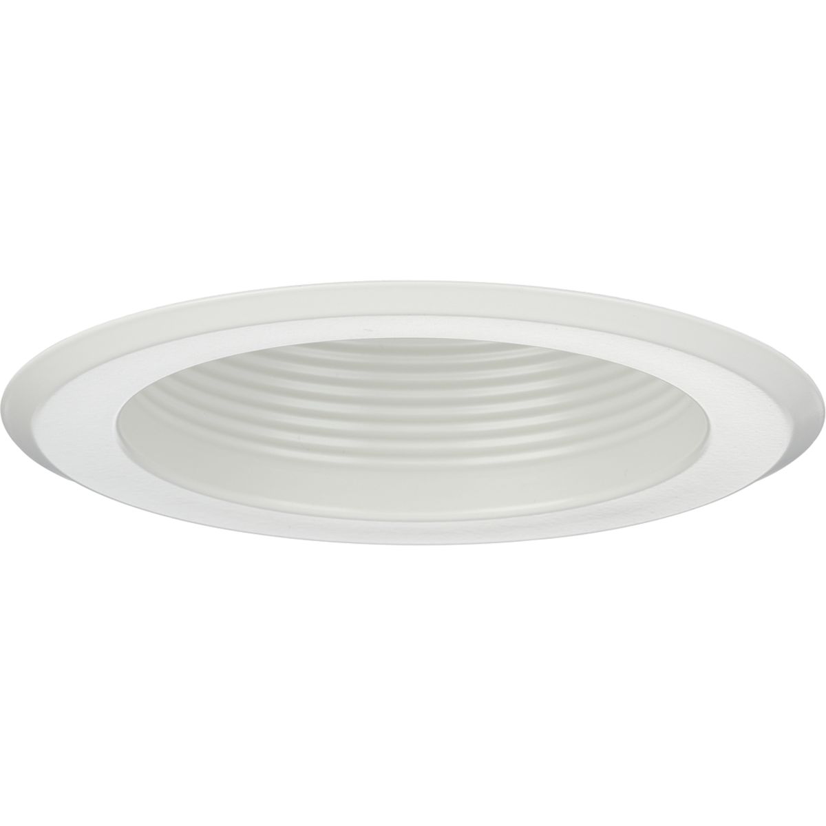 5" Shallow Step Baffle Trim in a Satin White finish. One-piece construction with integral matching satin white powder painted metal flange. The trim uses friction springs to attach to the housing to provide a flush fit against the ceiling. Compatible for use in Progress P851-ICAT and P1841-ICAT.