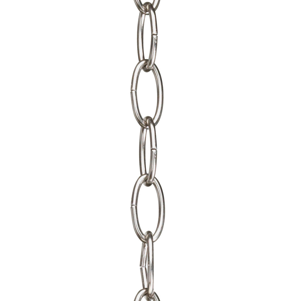 Brushed Nickel finish.;Standard 3 o'clock cut, oval chain.;10 Ft. overall length - may be shortened as needed.;9 gauge, 50 lbs. maximum weight.