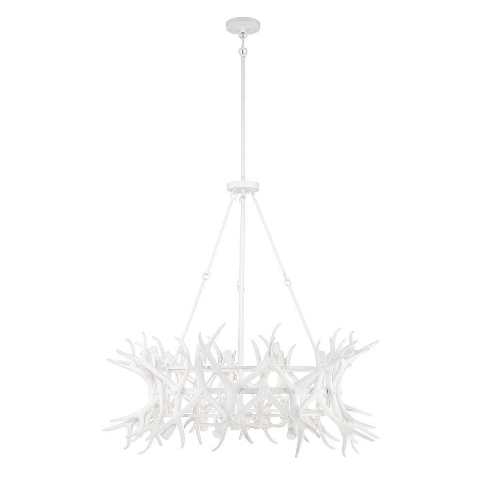 The chic Savoy House Daniels 8-light chandelier updates the rustic charm of antler chandeliers with a casual sophistication. With its fashionable matte white finish and open ring style, Daniels transports you to a cozy yet stylish mountain cabin. This chandelier is 40" in width and has an adjustable height ranging from 38" to 92". It uses eight candelabra size bulbs of up to 60 watts per bulb. Comes with four 12" downrods and one 6" downrod, plus 80" of cord.