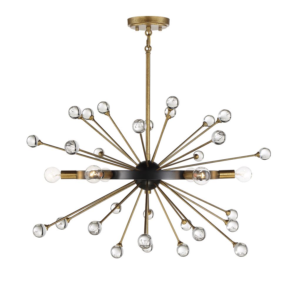 The Ariel 6-light chandelier from Savoy House offers a beautifully elegant and modern take on iconic Sputnik style. Slender Gold-finished arms topped with bulbs and crystal baubles emanate from a central sphere orbited by a ring finished in Como black. Ariel is 25" in diameter and has an adjustable height ranging from 18" to 72". It uses six standard size bulbs of up to 60 watts max per bulb. Comes with four 12" downrods and one 6" downrod, plus 80" of chain.