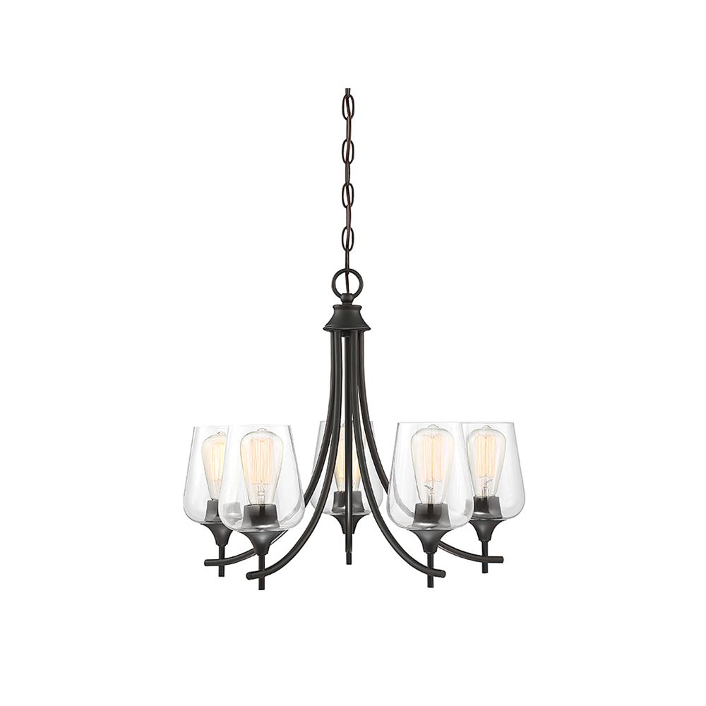 This 5-light chandelier from the Savoy House Octave collection has understated elegance. It features large curved shades of clear glass, minimal detailing and a bold English bronze finish.