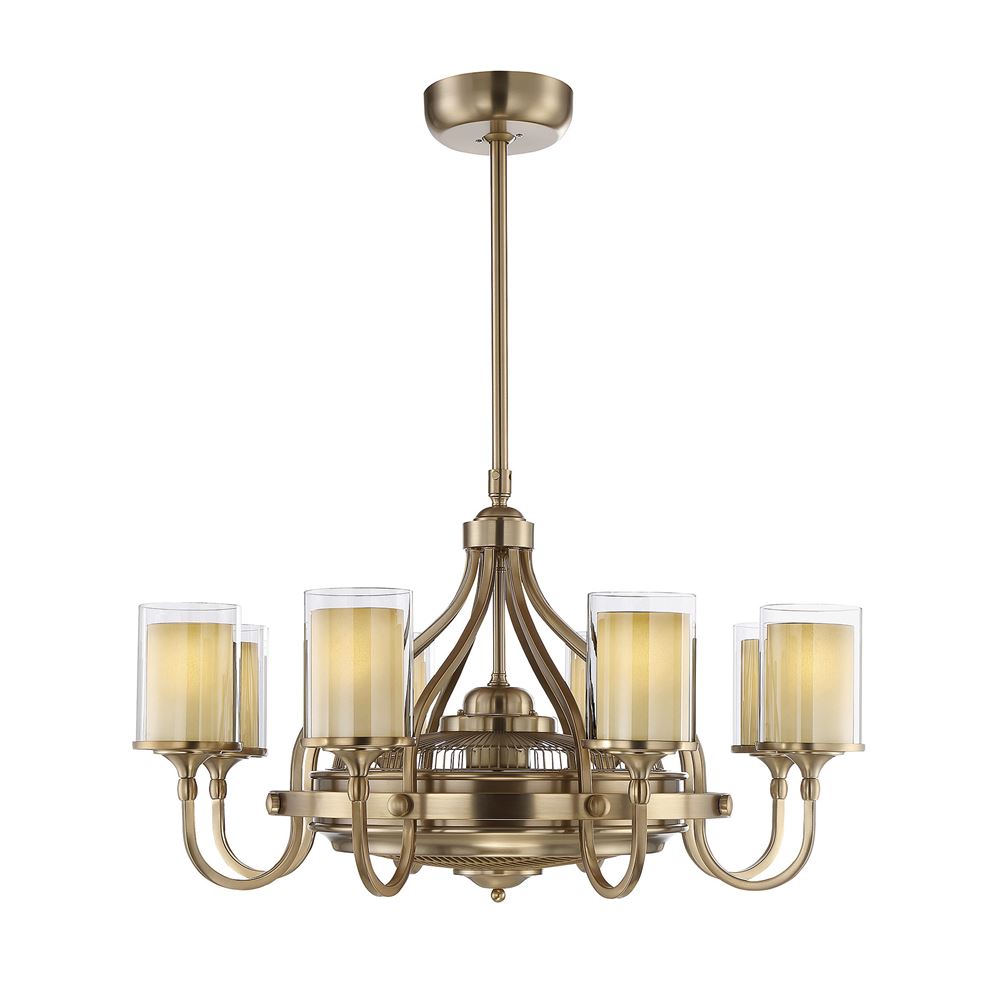 The Savoy House Etesian combines the beauty of a chandelier with the usefulness of a ceiling fan. The satin nickel finish and dramatically curving arms, topped with glass shades that are cream inside, create a contemporary appeal.