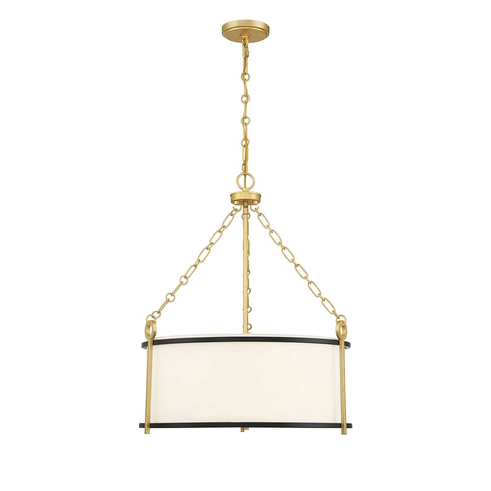 In the Savoy House Kian 3-light pendant light, drum pendant style is given a subtly glamorous twist with matte black banding and gold hardware detailing. Use it solo to spotlight its intricacies or in a group to create a lovely lighting look. Kian is 26" in height and 22" in diameter. It uses three standard size bulbs of up to 60 watts per bulb. Comes with 120" of chain and 144" of cord.